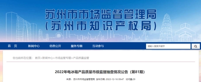 - 江蘇省蘇州市市場監管局抽查8批次電冰箱產品 不合格2批次