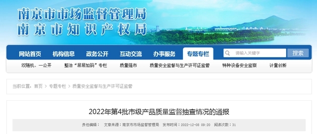 - 近日,南京市市場監督管理局發布2022年第4批市級產品質量監督抽查情況的通報。據通報,該局組織對機械及安防、電工及材料、電子電器、日用及紡織品、輕工產品、建筑和裝飾裝修材料6大類27