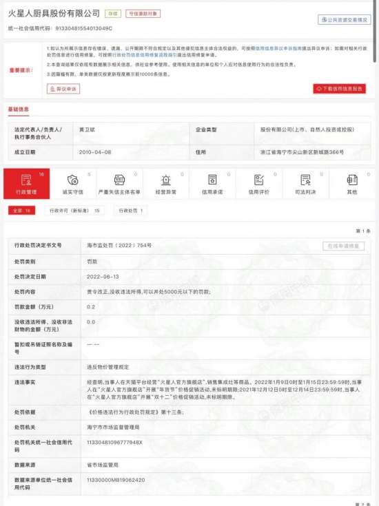 - 6 月 19 日,據企查查,火星人廚具股份有限公司(以下簡稱 " 火星人 ")新增 1 則行政處罰。 據悉,火星人的違法行為類型為違反物價管理規定。經查明 , 當事人在天貓平臺經營 " 火星人官方