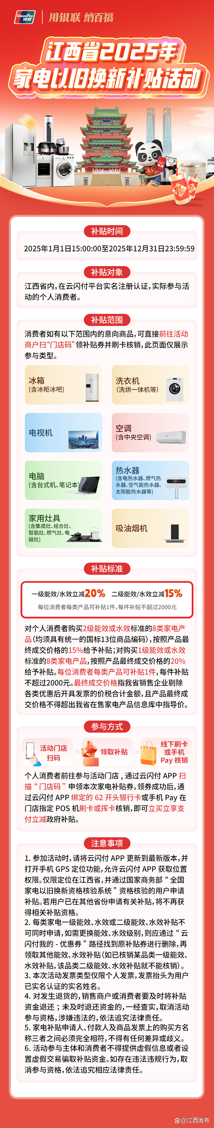 - 好消息!2025年江西省家電以舊換新補貼申請1月1日正式上線單件/單次最高補貼不超過2000元活動怎么參加?相關補貼的流程是怎么樣的?趕緊一起來看看! 分享