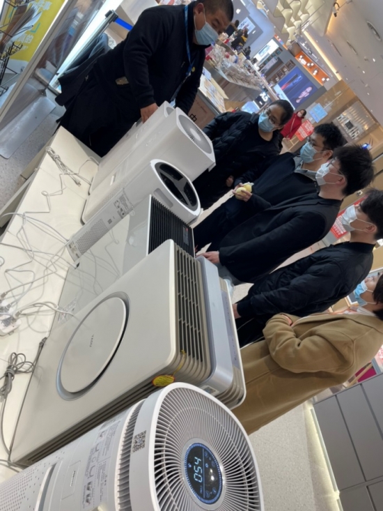 在蘇寧易購北京慈云寺橋店,空氣凈化器已經被搬到了門店顯眼位置,方便消費者選購。據導購王萬里透露,當天門店9點開門,購買空凈的消費者陡增,門店周圍的上班族大多選擇在路過時直接下單購買,隨即提走。