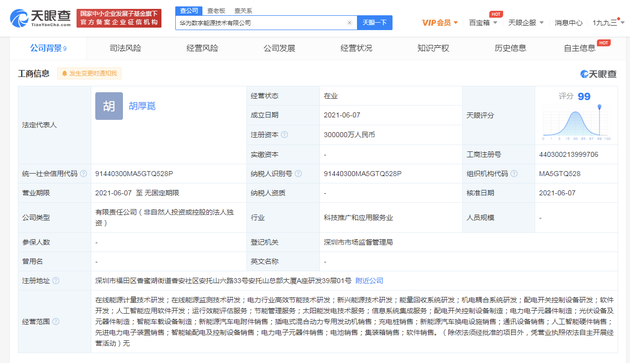 【劃重點】: 6月7日上午消息,天眼查App顯示,6月7日,華為數字能源技術有限公司成立,法定代表人為胡厚崑,注冊資本30億人民幣,經營范圍包括在線能源計量技術研發;新興能源技術研發;能量回收系統研發;機