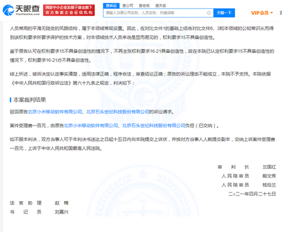 【劃重點】: 8月6日下午消息,天眼查App顯示,8月4日,北京石頭世紀科技股份有限公司等與國家知識產權局其他一審行政判決書公開,原告為北京小米移動軟件有限公司、北京石頭世紀科技股份有限公司。 判決