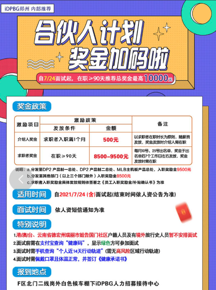 根據富士康招聘App“我要聘”的消息,7月24日起,鄭州IDPBG事業群開出了高達上萬元的招聘獎金。工人入職后,滿足“在職≥90天”條件即可獲得最高9500元的獎金,工人們稱之為“返費”。介紹他人入職還能拿500元/人的介紹獎金,獎金最高10000元。另一個手機相關事業群IPEBG,也開出了近似的獎金。IDPBG和IPEBG兩個事業群分別負責iPhone的成品組裝與零件加工。