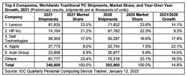 就PC而言,IDC數(shù)據(jù)顯示,2021年聯(lián)想PC(臺式機(jī)、筆記本、工作站)出貨量占據(jù)全球份額的23.5%,排名世界第一;華為則未上榜。