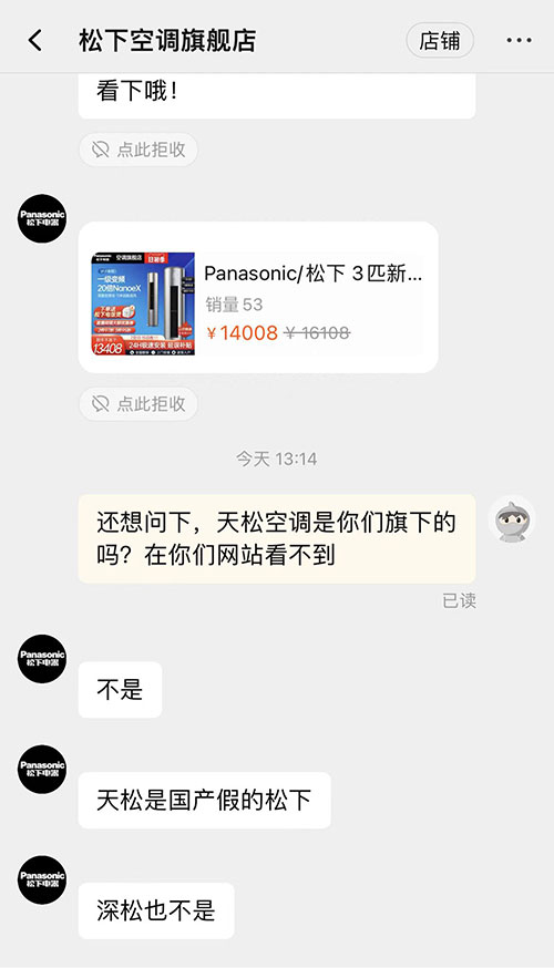 深松空調,1.5P,998元。還有天松空調,即“天津天松電器有限公司”出品,進價可能近千元,但賣給消費者1850元。還有假三菱空調,“消費者貪便宜,自己網上買,1300元。”