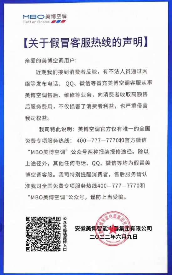 今年6月,美博空調也發布了“關于假冒美博空調客服熱線的聲明”,聲明中提到“有不法人員通過網絡等發布電話、QQ、微信等冒充美博空調客服,從事美博空調售后、維修等業務,向消費者收取高額售后服務費用。”美博空調也提醒消費者:售后服務要認準美博空調全國免費專項服務熱線400-777-7770和“MBO美博空調”公眾號。