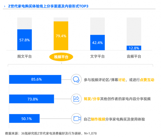 調研中我們發現,79.4%用戶通過參與討論、點贊、彈幕、轉發視頻或創作視頻等互動,分享家電產品購買、使用體驗。
