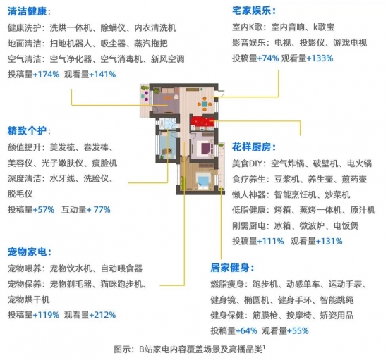 從站內家電熱播內容來看,專業測評(+161%)、房屋改造帶看(+191%)、情緒及日常分享、智能未來式生活(+144%)、高能DIY及手作五大類家電興趣內容成為熱門選題,過去一年間,播放量同比增長均超過1倍,互動量同樣高企。