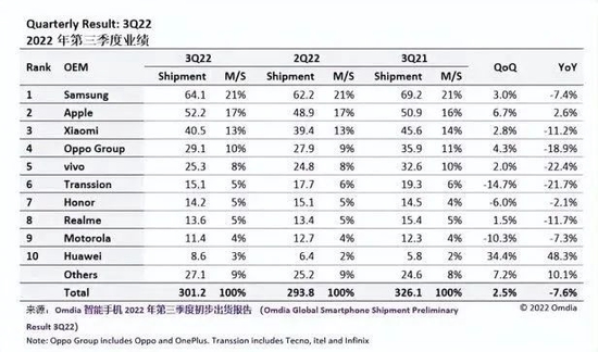 市場研究機構Omdia公布的全球手機品牌銷量榜顯示,2022年第二、三季度全球手機銷量榜前十名中,除蘋果、三星外,其余8席均被中國品牌攬入懷中,小米、OPPO、vivo、榮耀、Realme、華為等均榜上有名。