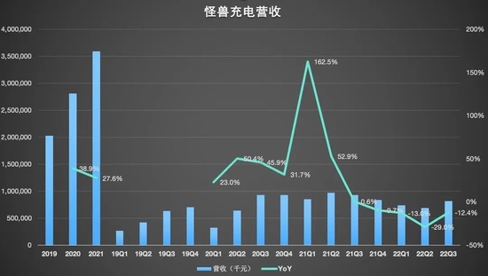 數據顯示,2022年Q3,怪獸充電實現8.15億元的營收,同比下滑12.4%,已經連續四個季度同比下滑。其中,移動設備充電業務收入7.91億元,同比減少11,7%。