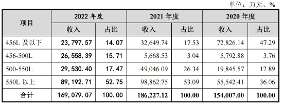 雪祺電氣的冰箱產品作為核心產品,按照容積大小可分為456L及以下、456-500L、 500-550L和550L四類。其中,報告期內,公司大容積冰箱的收入占比持續上升,主要原因是目前冰箱市場正處于我國人均可支配收入提升、消費升級主題下的結構調整階段,未來冰箱市場中大冰箱占比將逐漸提升。