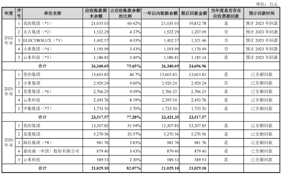 業績依賴大客戶的同時,大客戶也給雪祺電氣帶來大量應收賬款。2022年,雪祺電氣針對美的集團、太古集團、云米科技的應收賬款期末余額分別為2.21億元、1522.29萬元、1193.99萬元,合計占當期應收賬款余額的近七成。