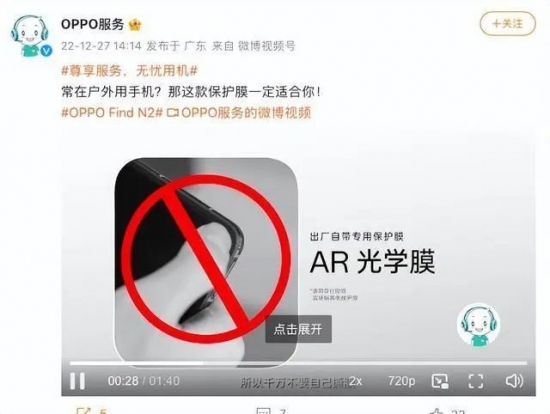2022年OPPO推出Find N2折疊屏手機發布不久之后,官方就已經通過官方微博科普了自帶貼膜的重要性,提醒用戶不要自行撕掉。至于原因除了用戶自己撕容易損壞屏幕外,還因為自帶的貼膜在保護屏幕這一基本作用外,還有對屏幕顯示方面的加分。