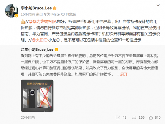 華為終端BG CTO李小龍當日發文表示,看到網上有不少銷售折疊屏手機保護膜的,懇請各位用戶千萬不要在折疊屏幕上再粘貼一層保護膜,也千萬不要撕除原廠的保護膜,折疊屏幕的每一層的材質、厚度和受力都是經過精心計算和驗證得出的最優結果,如果改變了受力模型,會使屏幕的壽命大幅縮短,并且可能喪失免費保修資格。如果原廠的保護膜損壞,可以到售后服務中心更換,每臺手機都有兩次免費更換保護膜的機會。