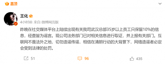 5月14日下午,小米集團公關部總經理王化在其個人微博發文回應了上述事件:“昨晚在社交媒體平臺上陸續出現有關我司武漢總部35歲以上員工只保留10%的信息,經查皆為謠言。現公司法務部門已對相關信息進行取證,并上報有關部門。”