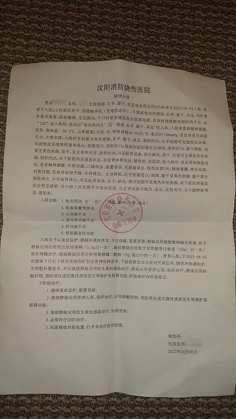 李女士提供的照片顯示,沈陽消防燒傷醫院對楊女士做出的入院診斷為:電擊傷5% II°-IV°,低血容量性休克,心功能不全,急性腎功能不全,肝功能不全,骨筋膜室綜合征,病情描述中寫道“雙足趾發干、碳化,部分創面可見黑色壞死焦痂”。李女士說,事發后,女兒一直在住院,已經做了四次手術,家里經濟條件難以支撐接下來的手術。