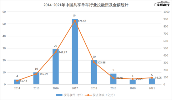 2014-2021年中國共享單車領域投資事件及投資金額統計,數據來源于觀研報告網,連線出行制圖