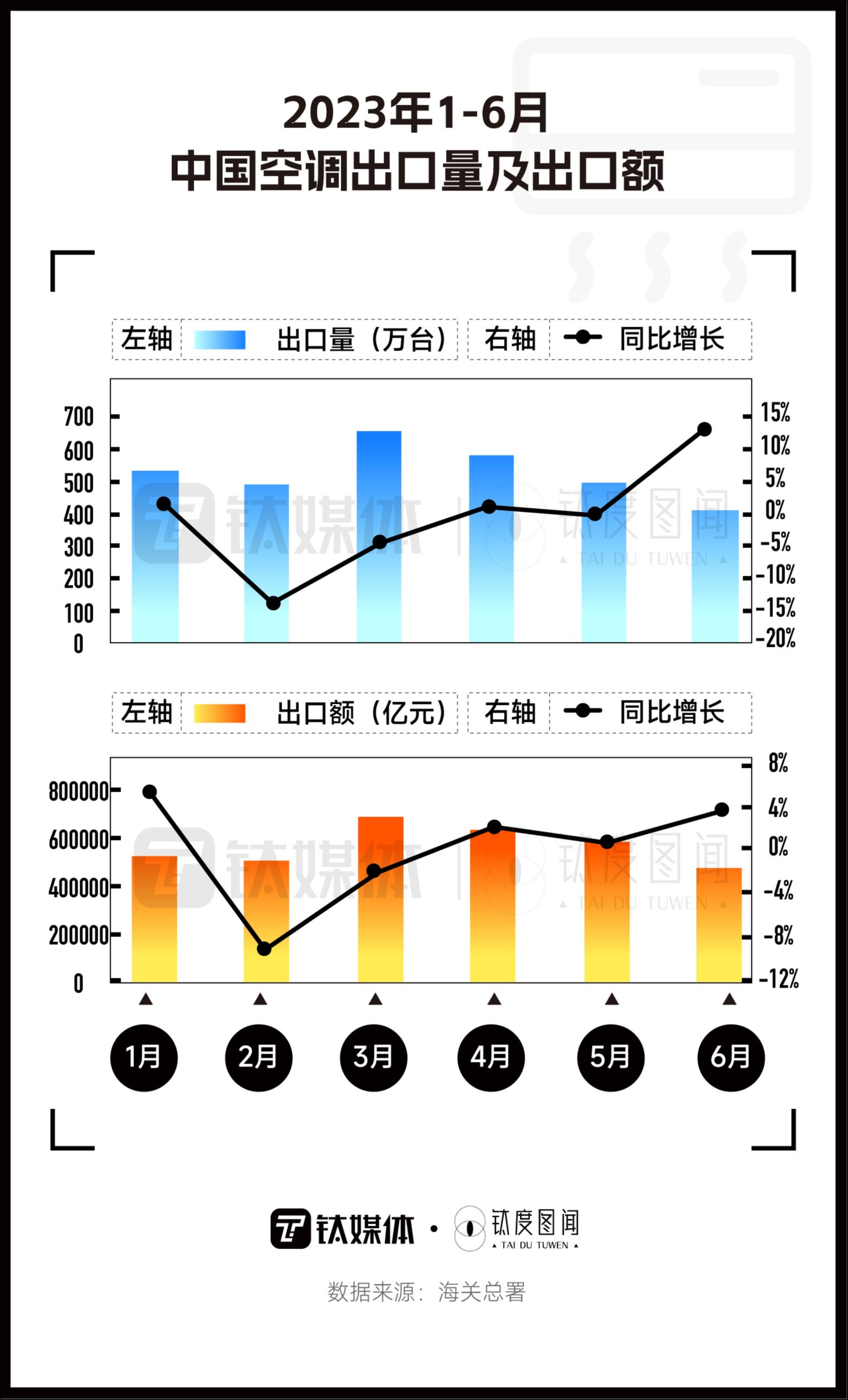 數據顯示,今年上半年,中國空調共出口3167萬臺,其中,今年4月和6月,空調出口量分別同比增長1.2%和13.2%。在出口額方面,今年上半年空調出口額共計341.7億元。從今年4月起,空調的出口額數據就持續向上,今年4月、5月、6月,中國空調出口額比去年同期分別增長了2.6%、1.1%和4.1%。