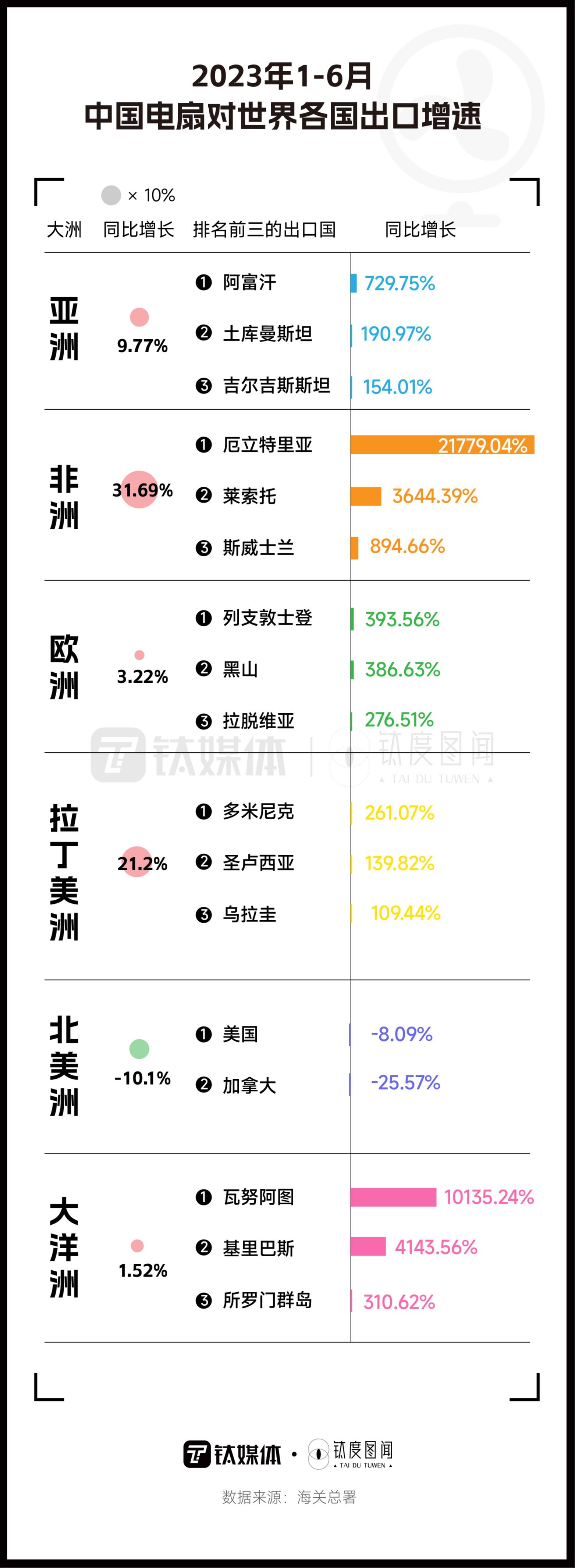 從細分區域來看,除北美洲外,中國電扇對亞非歐拉美、大洋洲的出口額同比增速均呈正增長。其中,中國電扇對亞洲的出口金額最高,非洲的出口同比增速最高,同比增長31.69%。其次,出口額增速排名第二的是拉丁美洲,增幅為21.2%。而亞洲、歐洲、大洋洲的同比增幅較小,均在10%以下。