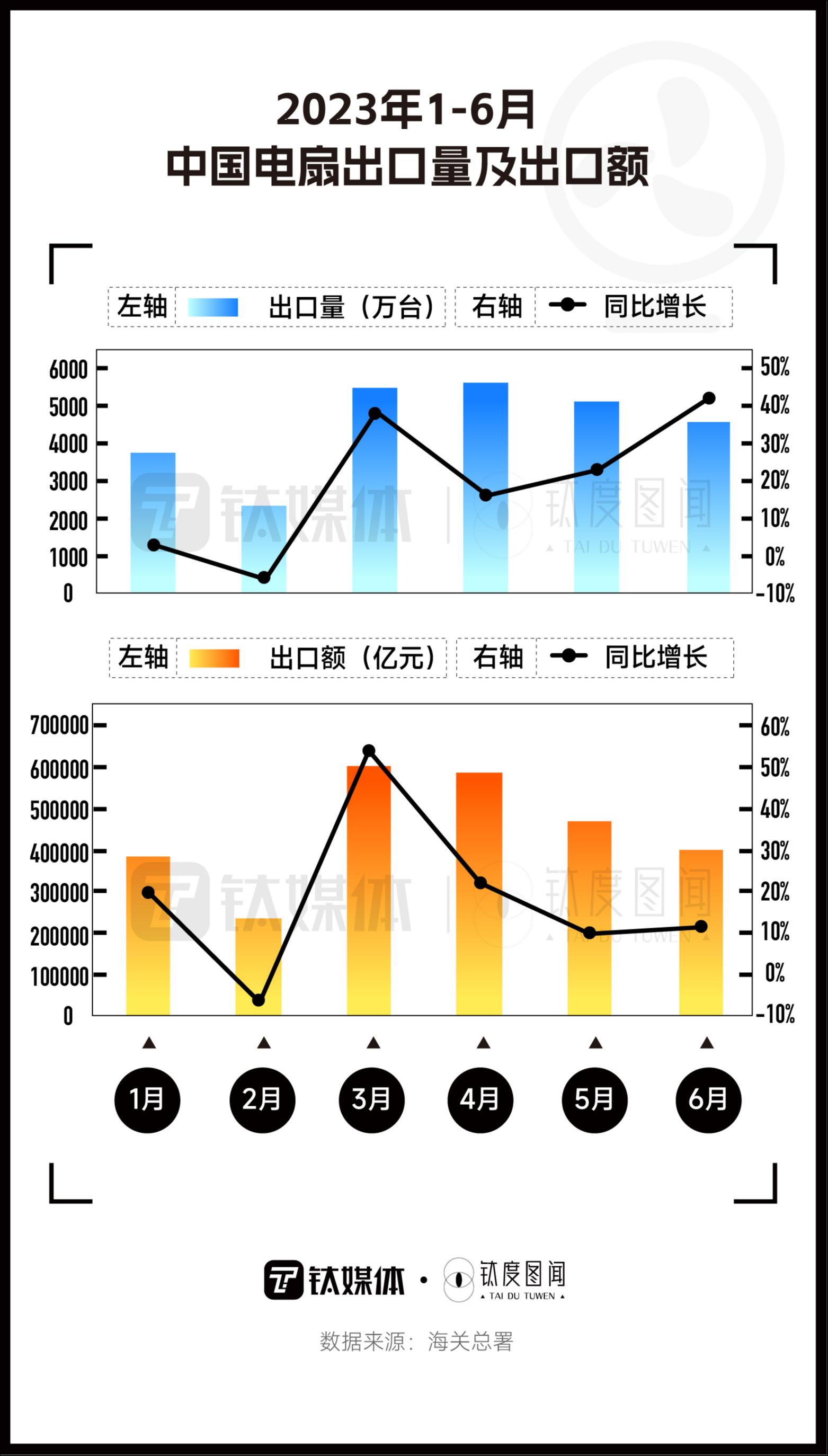 除了空調,電扇的海外需求也很大。2023年上半年,中國電扇出口量達26620萬臺,同比增長19.1%,出口金額達257.8億元,同比增長15.9%。從3月以來,中國電扇的出口持續走高,6月當月,中國電扇出口量達4591萬臺,同比增長42.2%,增幅達上半年最高。據深圳海關消息,今年前五個月,從深圳口岸出口的電風扇就有135.5億元,同比增長27%。