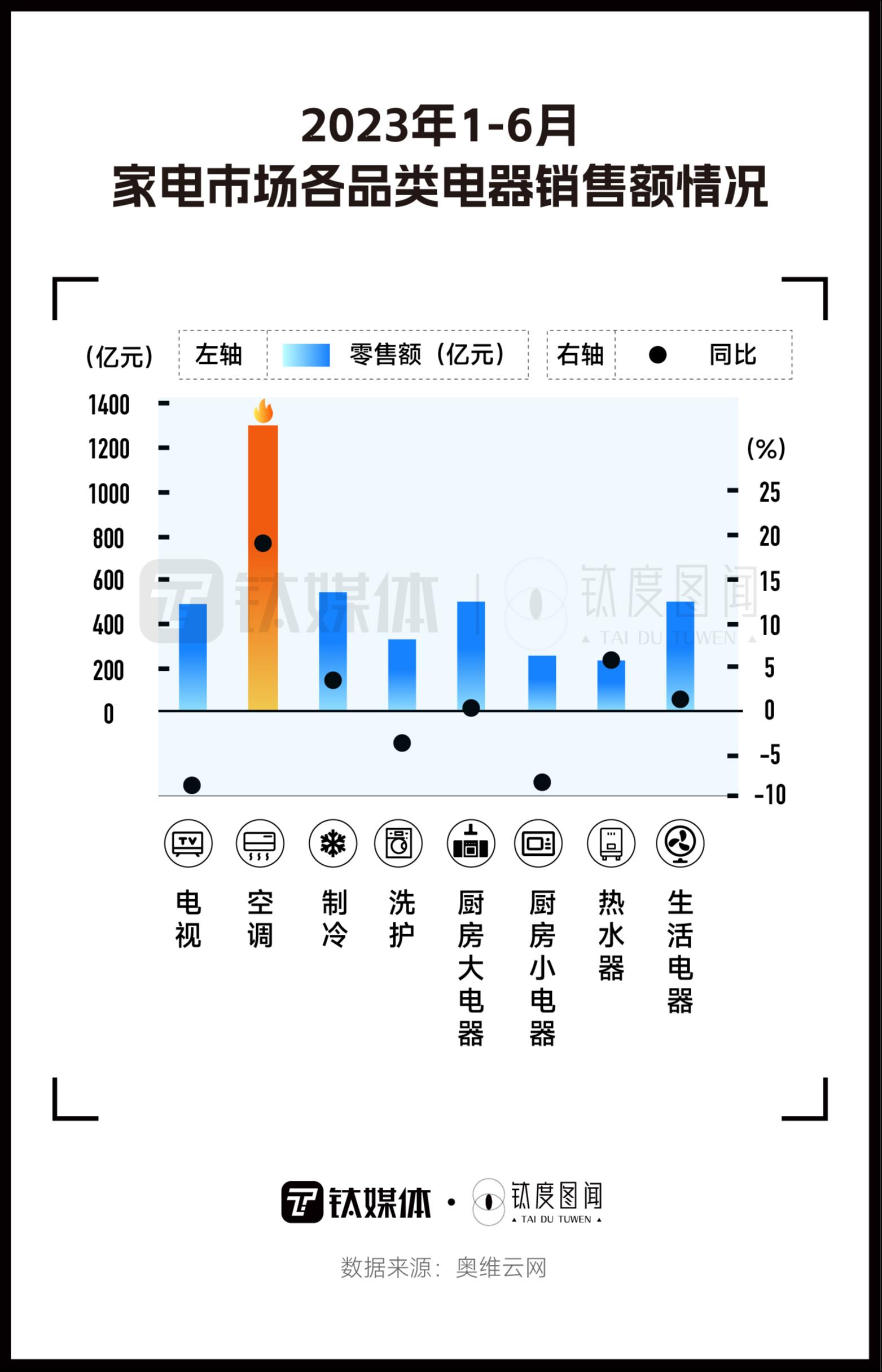 今年入夏以來,氣溫逐漸攀升,連續的高溫天氣推高清涼消暑家電的市場需求。今年上半年,在家電市場各品類電器中,空調品類一騎絕塵,銷售額達1302億元,同比增長19.5%,領漲市場。其次,包括冷柜、冰箱在內的制冷類電器銷售額僅次于空調,達545億元,同比增長3.5%。