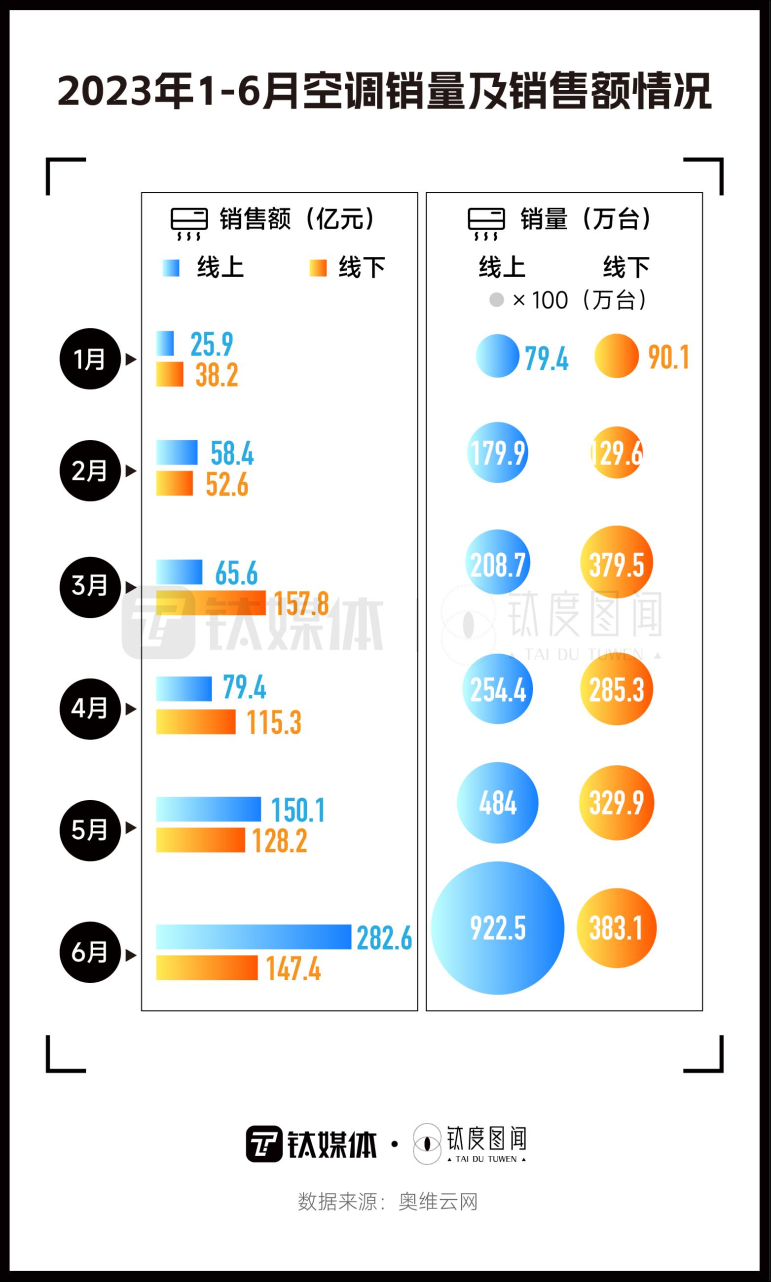 具體來看,2023年1-6月,空調市場線上線下渠道都很火熱。其中,空調的線上銷量為2129萬臺,同比增長67.6%;銷售額為662億元,同比增長74.2%;空調的線下銷量為1597萬臺,同比增長80.7%;銷售額為640億元,同比增長84.3%。