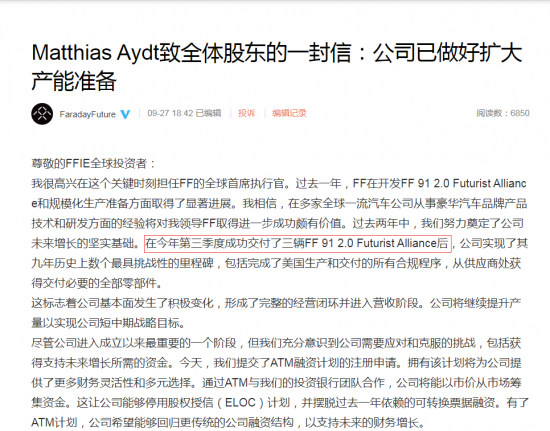 9月27日,FaradayFuture(法拉第未來,下稱“FF”)官方公布了FF全球首席執行官Matthias Aydt致全體股東的一封信。