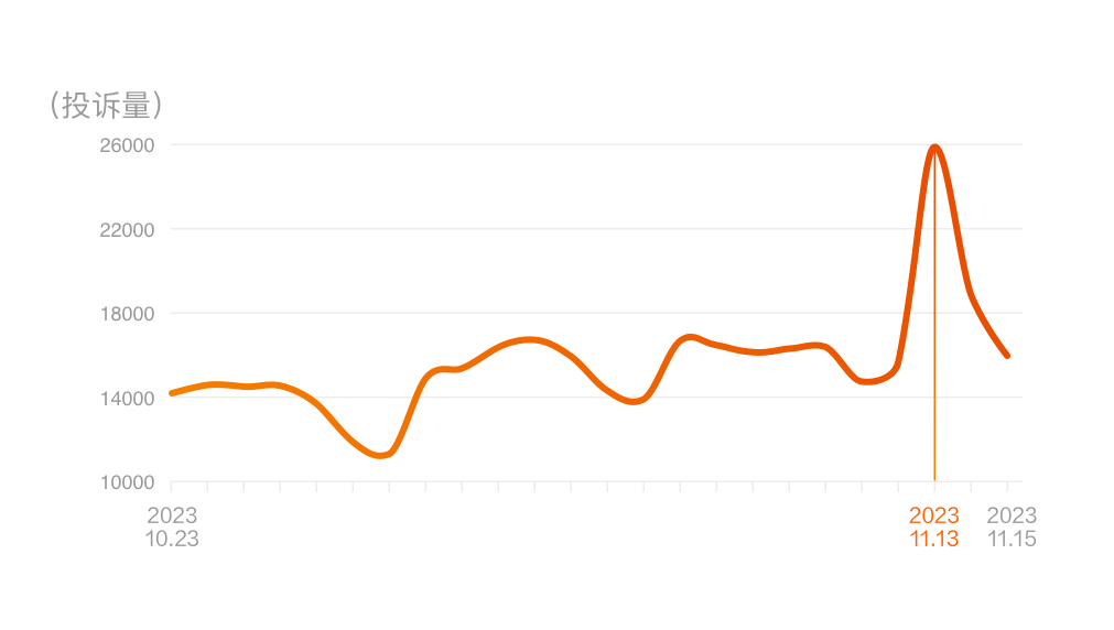 “雙十一”期間投訴整體呈波動上升趨勢,隨著預售、付尾款等節點逐級遞增,11月13日因天貓蘋果產品大額優惠券且拒絕價保引發大量投訴,投訴達到峰值,單日有效投訴超2.5萬單。