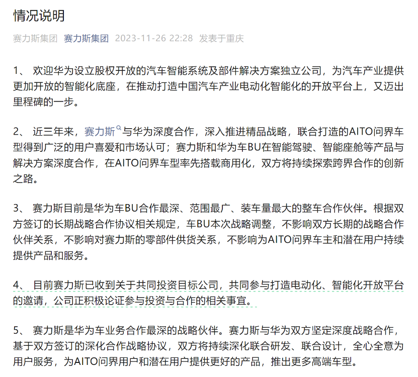 在市場猜測誰會加入新公司的股東行列之時,華為智選汽車的“老朋友”賽力斯,便于26日深夜在其官微上發布聲明。