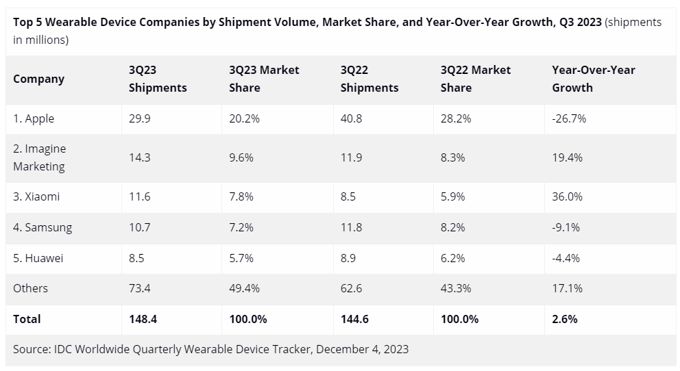 IDC報(bào)告2023Q3全球可穿戴設(shè)備市場(chǎng):小米超過(guò)三星增長(zhǎng)36%