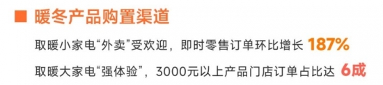 “斷崖式”降溫來襲,取暖小家電“外賣”成為消費者即時御寒的新選擇,取暖小家電訂單量環比增長187%。取暖大家電體驗屬性明顯,線下看得見、摸得著的體驗式消費能大大提升消費者的購買決策效率。11月22日以來,蘇寧易購門店3000元以上取暖大家電訂單占比達6成。