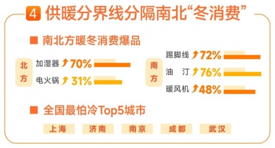 供暖分界線分隔南北“冬消費”。報告顯示,南方地區踢腳線、油汀、暖風機銷售分別同比增長72%、76%、48%,北方地區供暖干燥,加濕器、電火鍋成為北方人過冬的“標配”。上海、濟南、南京、成都、武漢的取暖消費增速走在全國前列,成為全國最怕冷TOP5城市。