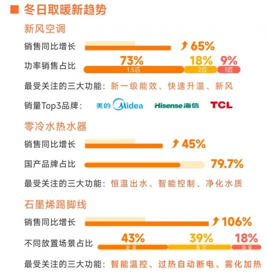 取暖消費新勢力不斷涌現。11月22日以來,新風空調銷售同比增長65%,即開即熱、恒溫出水的零冷水熱水器銷售同比增長45%,石墨烯踢腳線取暖器同樣表現亮眼,銷售同比增長106%。