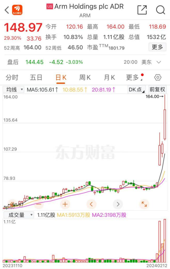 同樣股價表現亮眼的還有軟銀持股的芯片設計公司ARM,美東時間2月12日,該股一度大漲42%,截至收盤,上漲29.3%,報收148.97美元/股,市值為1532億美元(約合人民幣1.1萬億元)。該股近期表現極為活躍,近三個交易日,股價已實現翻倍。