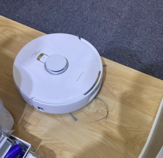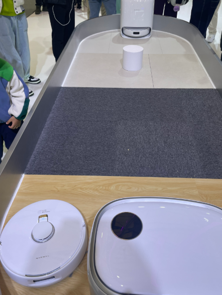 在展臺的顯眼位置設置有云鯨掃地機器人J4的演示區,展臺材質特別設置為家庭中常見的地板、地毯和瓷磚等材質。工作人員在向參展觀眾介紹云鯨掃拖機器人J4搭載的創新技術,拿出了準備好的頭發、食品殘渣進行清掃模擬,給觀眾更直觀的清掃效果展示。
