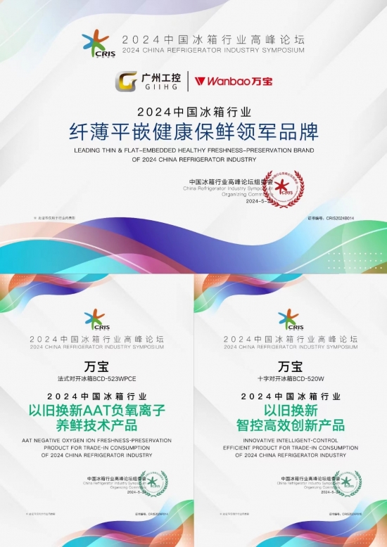 在本次論壇上,萬寶法式對開門冰箱BCD-523WPCE斬獲“2024中國冰箱行業以舊換新AAT負氧離子養鮮技術產品”獎,萬寶十字對開門冰箱BCD-520W斬獲“2024中國冰箱行業以舊換新智控高效創新產品”獎,同時萬寶自身還獲得了“2024中國冰箱行業纖薄平嵌健康保鮮領軍品牌”獎。滿載的榮譽,彰顯了萬寶在冰箱領域的不凡表現。