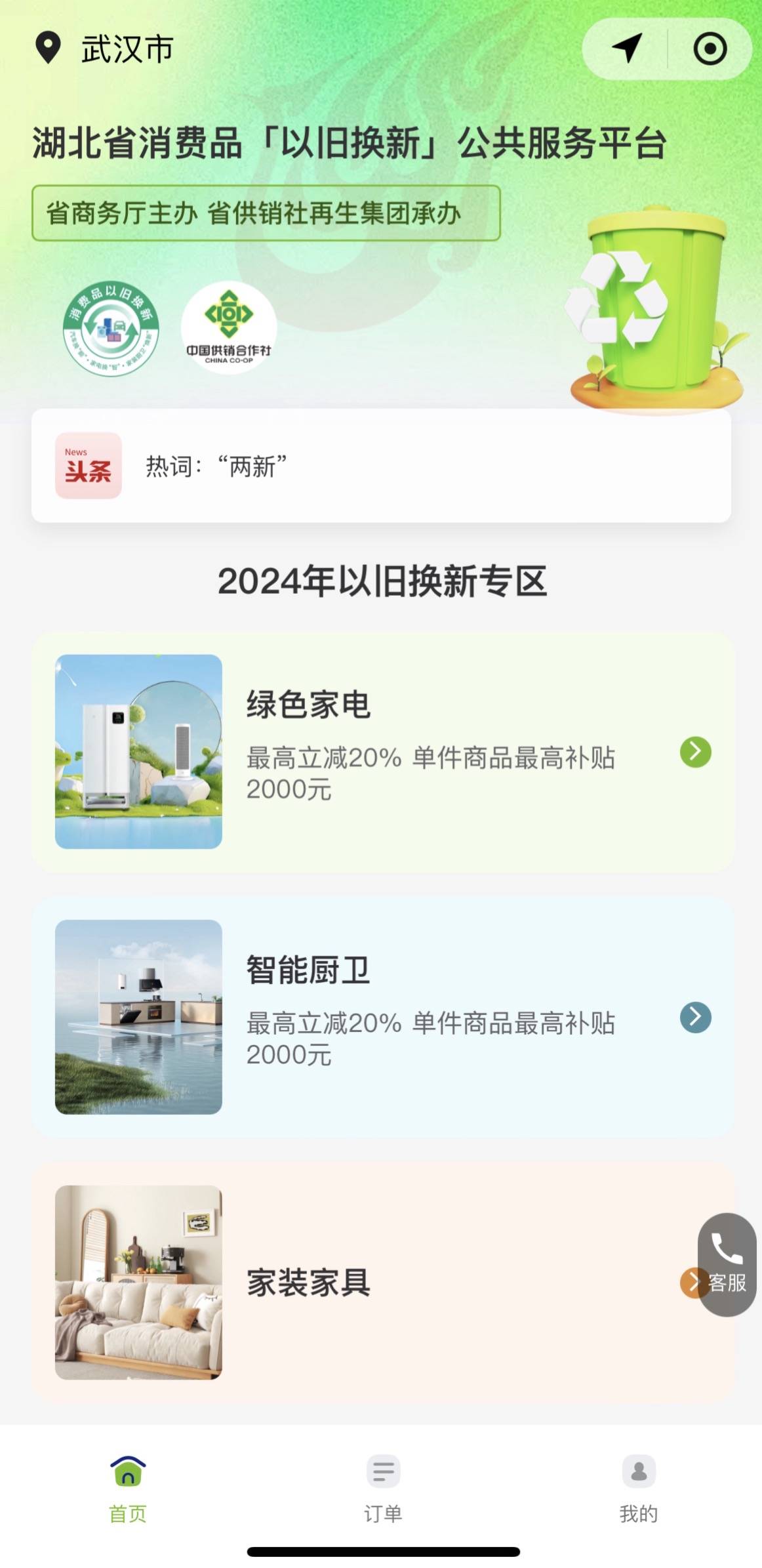 省內(nèi)個人消費者登錄“湖北供銷回收”微信小程序,進入“2024以舊換新專區(qū)”綠色家電欄目,選擇“先購新再守舊”或“先收舊再購新”補貼方式;