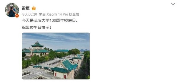 - 11月29日,武漢大學迎來了其130周年校慶日。在這個特殊的日子里,小米公司創始人、武大校友雷軍發微博祝賀母校生日快樂。他表示,今天是武漢大學的130周年校慶日,祝母校生日快樂。