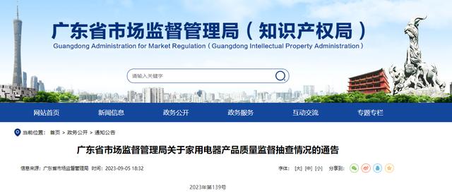 - 2023年9月5日,廣東省市場監(jiān)督管理局網(wǎng)站發(fā)布關(guān)于家用電器產(chǎn)品質(zhì)量監(jiān)督抽查情況的通告(2023年第139號)?! ⊥ǜ娣Q,根據(jù)《中華人民共和國產(chǎn)品質(zhì)量法》《廣東省產(chǎn)品質(zhì)量監(jiān)督條例》及《產(chǎn)品