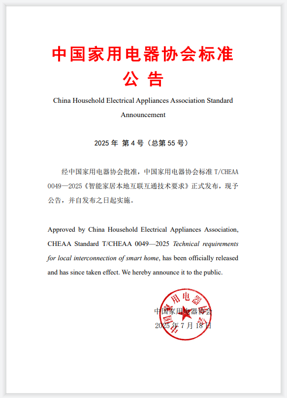 - 中國(guó)家用電器協(xié)會(huì)標(biāo)準(zhǔn)T/CHEAA 0049—2025《智能家居本地互聯(lián)互通技術(shù)要求》正式發(fā)布