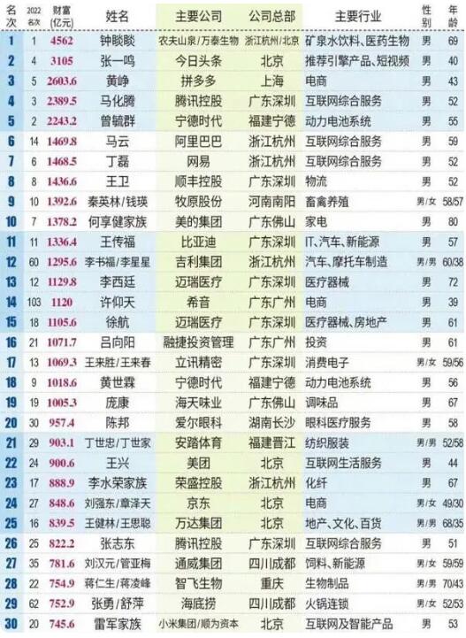 - 5月16日,《2023新財富500富人榜單》正式發布。根據新財富的統計,目前中國排名前十的富豪分別為鐘睒睒、張一鳴、黃錚、馬化騰、曾毓群、馬云、丁磊、王衛、秦英林/錢瑛、何享健家族。其中