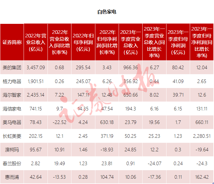 - 上市公司2022年報和2023年一季報披露均已收官,證券時報梳理出十大熱門行業公司的營收、利潤及相應增速數據,以饗讀者。 家電市場緩慢復蘇 今年一季度,國內家電市場雖整體下滑,但復蘇