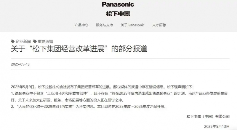 - 5月13日,松下電器在官網發布聲明稱,2025年5月9日,松下控股株式會社發布了集團經營改革的進展,部分媒體的報道中存在錯誤信息。松下現聲明如下: 1. 課題事業中不包含“工業用馬達和車