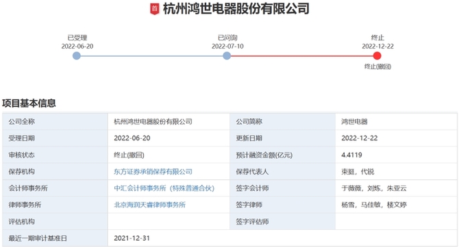 - 據深交所官網發布的信息顯示,近日,杭州鴻世電器股份有限公司(以下簡稱“鴻世電器”)申請撤回創業板IPO申請文件,深交所決定終止該公司首發上市審核。在此之前,深交所曾就公司首發