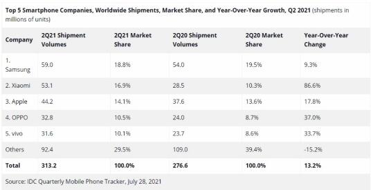 - 市場研究機構IDC發布的最新報告數據顯示,2021年第二季度全球智能手機市場出貨量達到3.132億臺,同比增長13.2%,略高于此前IDC預測的12.5%。 2021年第二季度,排名全球智能手機市場出貨量前