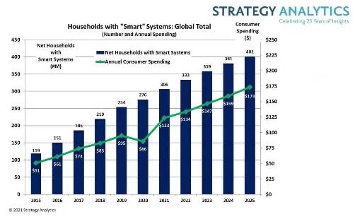 - 市場研究機構Strategy Analytics發布的研究報告指出,在2020年受到新冠疫情的負面影響后,全球消費者在智能家居解決方案上的支出將在2021年增長44%到1230億美元。 在Strategy Analytics