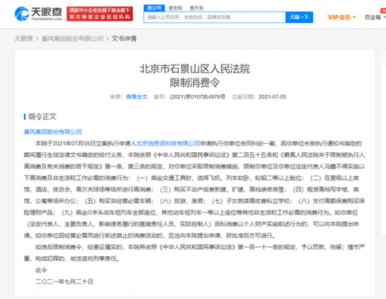 - 天眼查App顯示,近日,暴風集團股份有限公司新增一則限制消費令,限制消費對象為該公司及其法定代表人馮鑫,相關案號為(2021)京0107執4976號,審理法院為北京市石景山區人民法院。 天眼查App