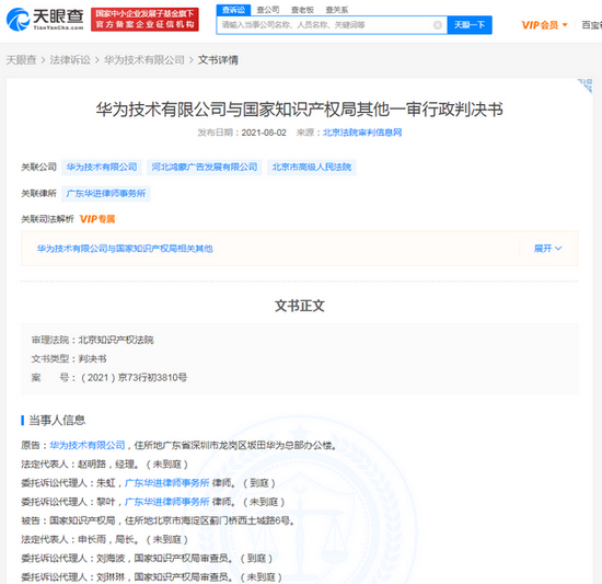 - 8月2日下午消息,天眼查App顯示,8月2日,華為技術有限公司與國家知識產權局其他一審行政判決書公開,案號(2021)京73行初3810號,審理法院為北京知識產權法院。 判決書顯示,原告華為技術有限公