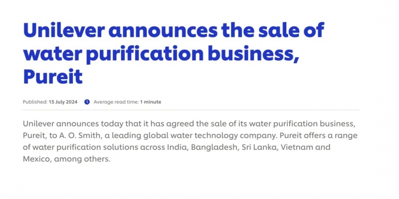 - 聯合利華,宣布賣掉這家凈水公司